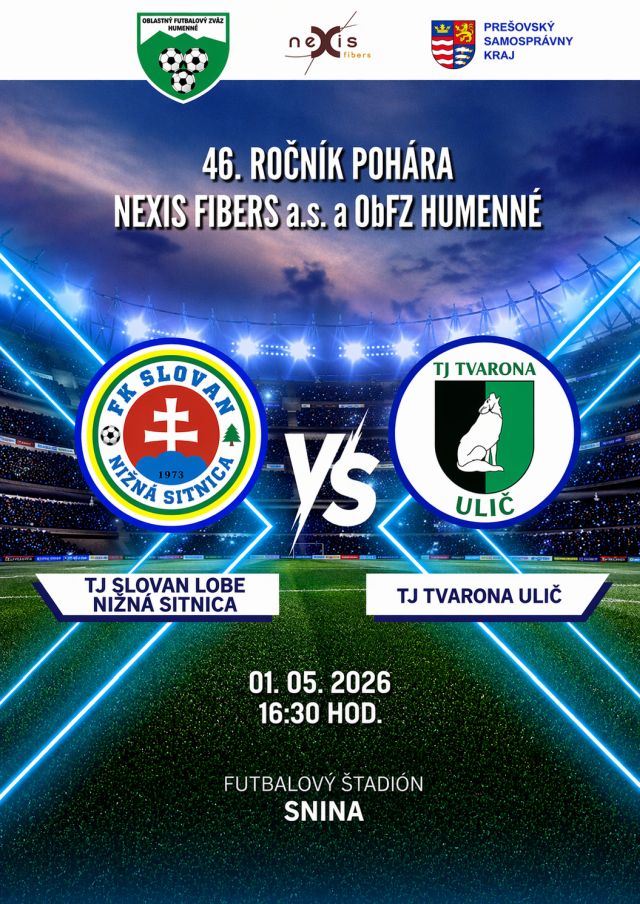 FINÁLE POHÁRA NEXIS FIBERS a ObFZ- 1.MÁJA 2026 (PIATOK) o 16,30 hod. FUTBALOVÝ ŠTADIÓN SNINA: TJ Slovan Lobe N.SITNICA - TJ Tvarona ULIČ